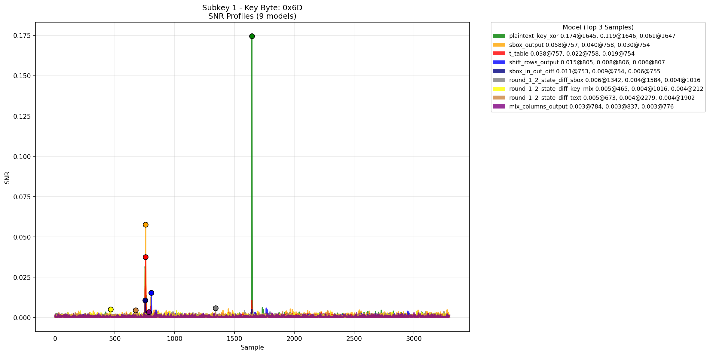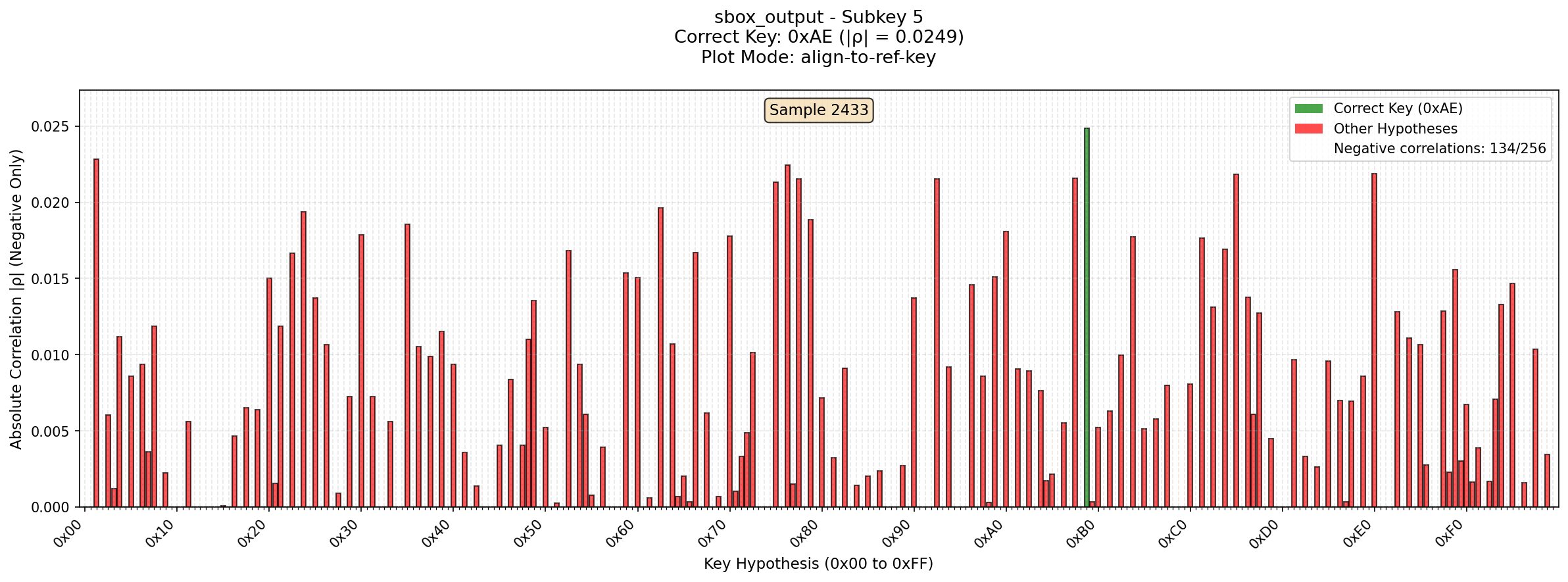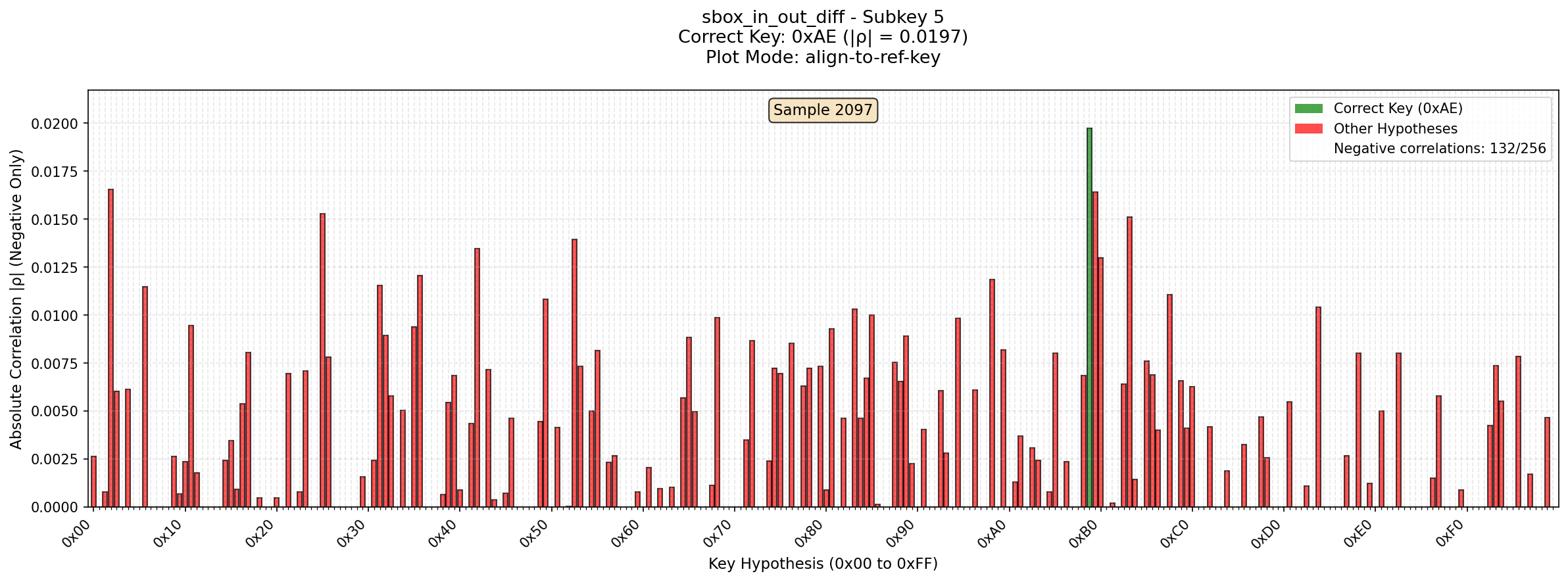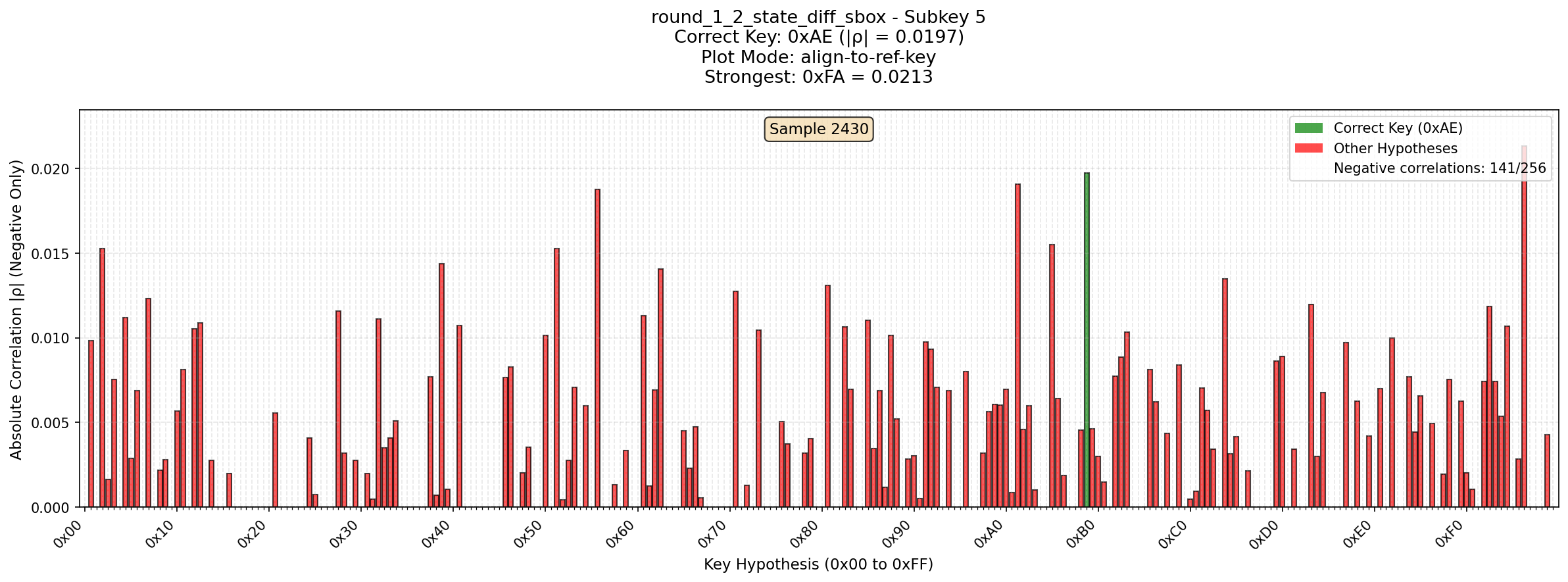 - Middle eight bytes don’t have strong correlation for the HW(PT ^ KEY) model. Some wrong subkey candidates win. At the same time there are leaks for sbox_output and shift_raw_output models.