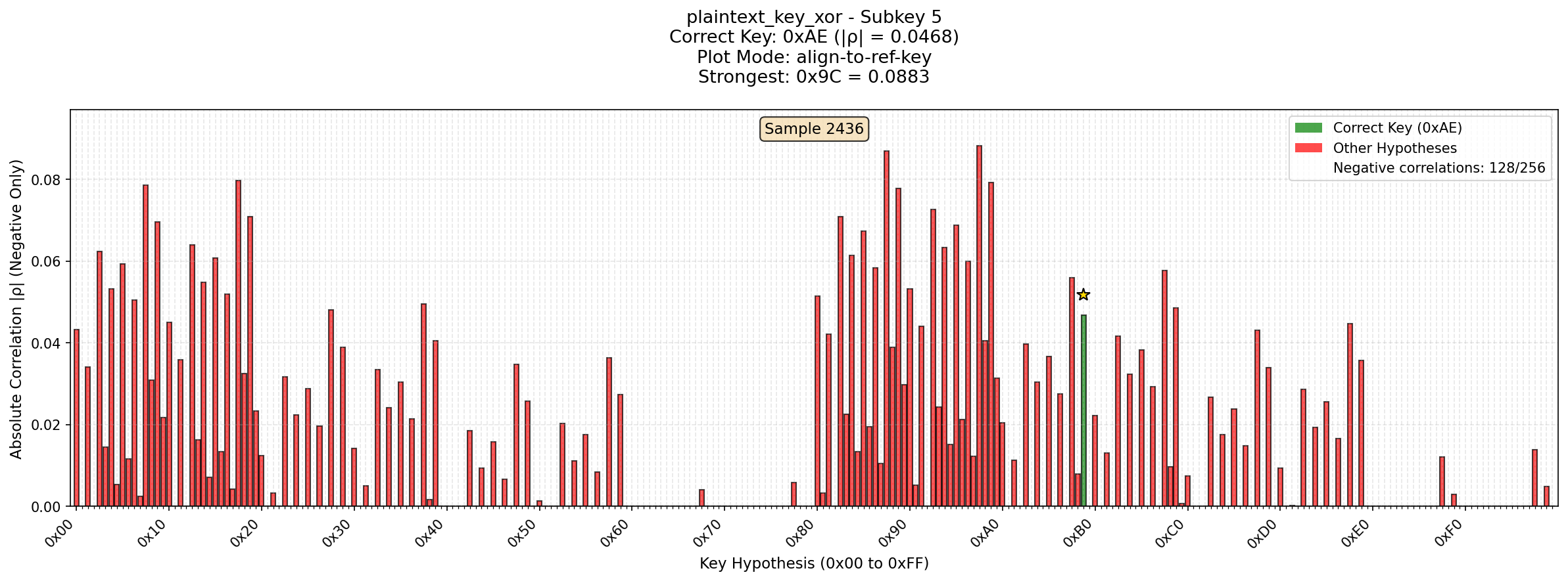 Also I noticed that correlation for the correct subkey is strictly negative. So I filtered all positive correlations. With these changes it looks like the key can be completely recovered.