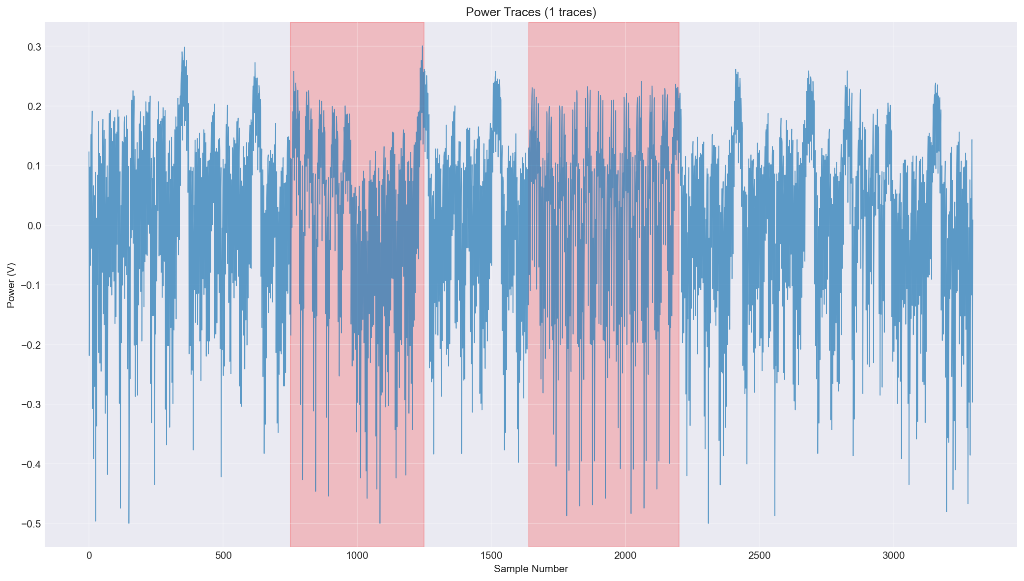 This picture reveals that the same input plaintext is processed twice which is consistent with the full trace picture. This is why I suggested there are two AES processings which work with the same plaintext input. So it doesn’t look as two passed AES.