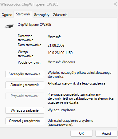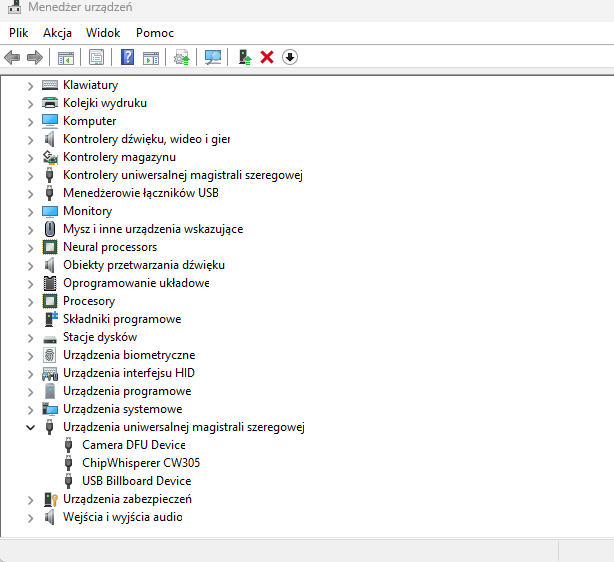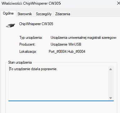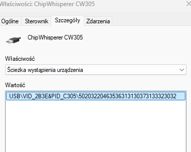before I started this setup test I checked that chipwhisperer is available under Universal Serial Bus devices, but what wonder me is device instance path I don’t see substring “MI_00“