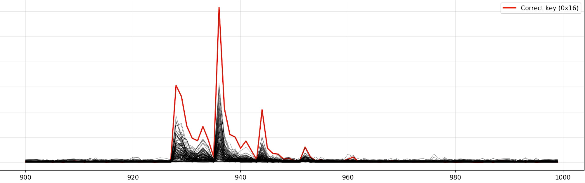 with 30000 power traces 14 bytes are clearly recovered. 8-th and 16-th key bytes are noisy. Increasing the power traces up to 100K makes possible to recover the whole key.