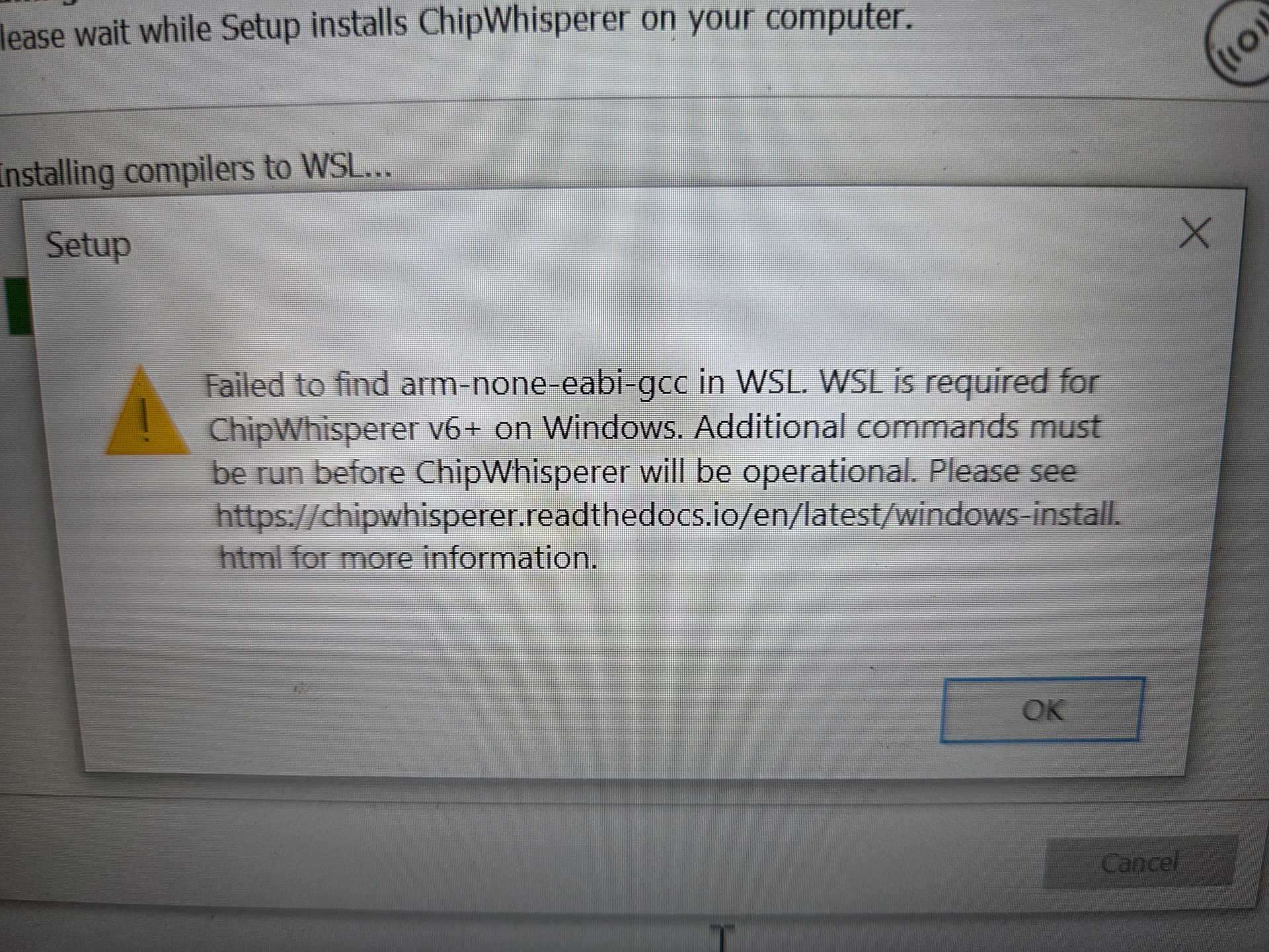 so I purchased my chipwhisper husky last year on a whim, forgot about it, remembered i had it and thought its now time to get it to work! , i downloaded the windows based installer, but i am receiving a weird error… i tried looking for the problem in the help… well that doesn’t appear to show much. I tried installing WSL but doesn’t appear its being seen by the install i have unloaded a picture of what fault i am receiving, any direction would be great.