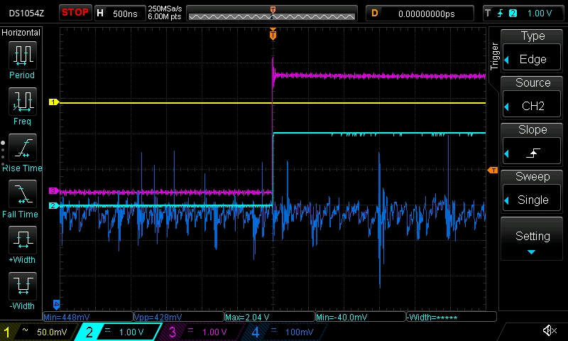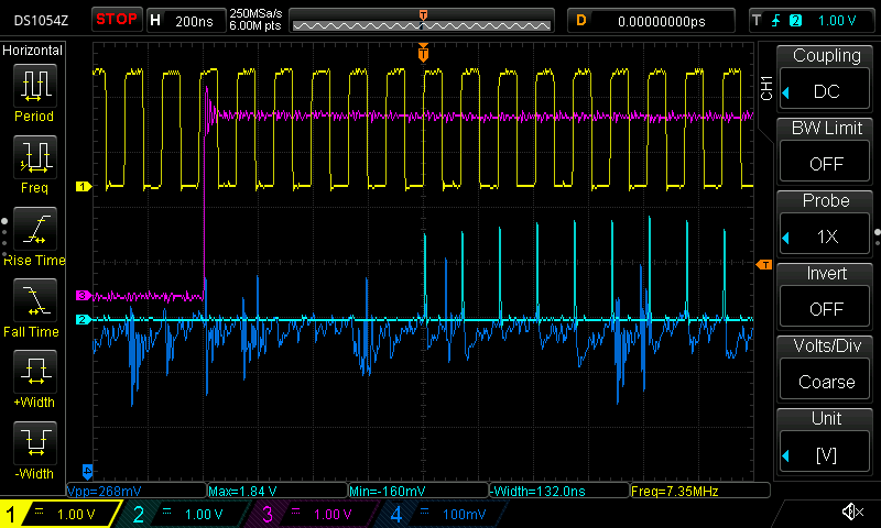 However no idea why the glitch (cyan) comes ~800 ns later than trigger (magenta).