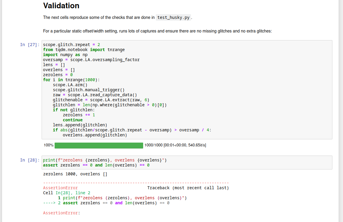 I have no idea where is the bug, since 800 ns is around 1.25 MHz which is very slow. But also the “Validation” part of “03 Husky Glitching” always fails for me, if it might have to do something with it: