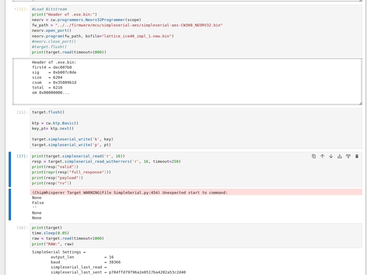 I am trying to capture power traces using ChipWhisperer Husky but I cannot get any UART communication with my custom FPGA target. I don’t use a ChipWhisperer reference hardware design, but a custom RISC-V–based FPGA design running on the CW312T iCE40(NEORV32 softcore).