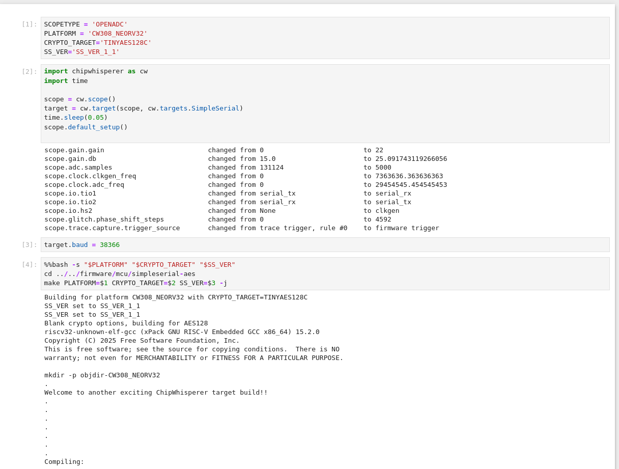 On the firmware side, I am using the standard ChipWhisperer simpleserial-aes.c firmware without functional modifications.